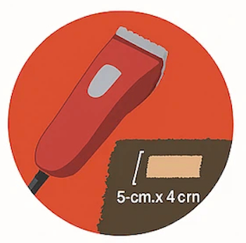 Étape 2 : À l’aide d’une tondeuse à lame ou équivalent, rasez une zone de 5 cm sur 4 cm aussi près de la peau que possible.